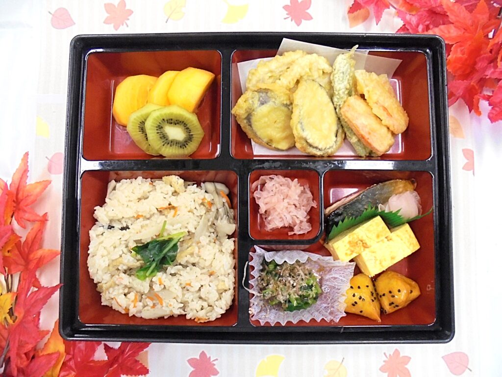 投稿日: 2025年11月29日2025年12月8日 投稿者: sensekiblog[2025栄養課]11月行事食のご案内 2025年11月19日 昼食 「霜月弁当」 <お品書き> ・きのこご飯 ・マスの西京漬け焼き ・精進揚げ ・香の物 ・キウイ/梨