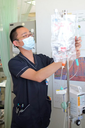 入院中の患者さんを、看護師が優しくサポートしています。